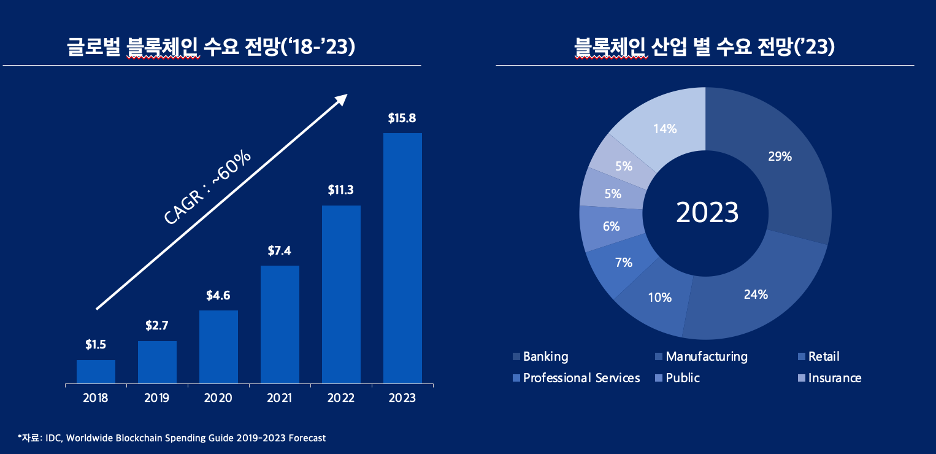 실제로 월마트 중심의 Food Trust와 머스크사의 물류 관리, JP Morgan의 쿼럼(Quorum)과 같은 프로젝트를 보면 대부분 퍼블릭이 아닌 프라이빗 엔터프라이즈 블록체인을 사용하고 있다. 매년 기업의 엔터프라이즈 블록체인 기술에 대한 투자는 증가하고 있으며, 적용 분야에 있어서도 기존 금융과 제조에서 물류, 리테일, 공공 분야 등으로 확장되고 있다.