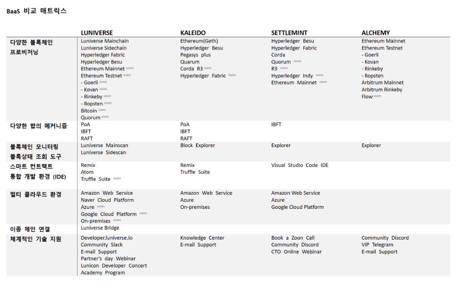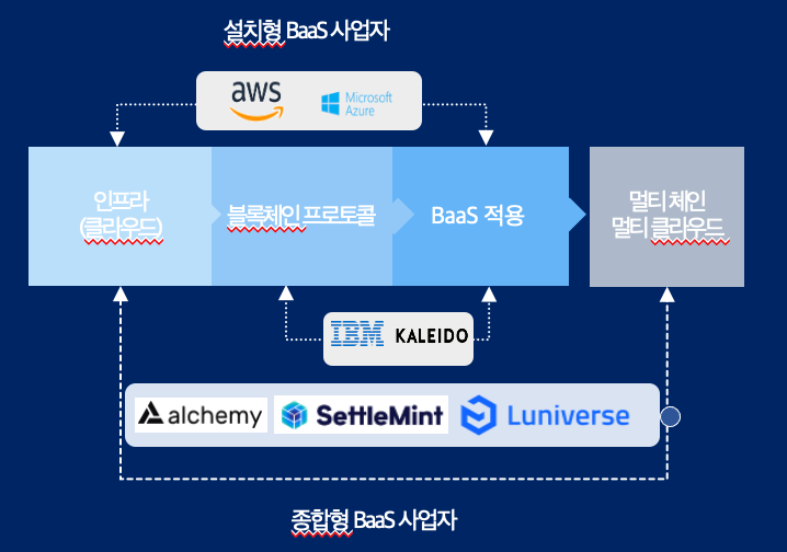 설치형 BaaS는 아마존 AWS 매니지드 블록체인, MS 애저 블록체인 서비스, IBM처럼 인프라 클라우드를 보유한 업체들이 이더리움이나 하이퍼레저 같은 오픈소스 블록체인을 보유한 클라우드 인프라에 손쉽게 설치,운영할 수 있는 템플릿을 제공한다. 이에 반해 종합형 BaaS는 다양한 클라우드 환경하에서 이더리움, 하이퍼레저, 베수, 쿼럼 등 다양한 블록체인을 설치, 운영하고 더불어 블록체인 서비스 개발에 필요한 다양한 부가 기능과 개발 환경을 제공한다. 국내 업체로는 람다256의 루니버스와 해외 업체로는 알키미(Alchemy), 셋틀민트(Settlemin), 칼레이도(Kaleido) 등이 있다. 이들 업체 중 IBM은 하이퍼레저만을 지원하며 루니버스, 칼레이도, 셋틀민트 등이 멀티 클라우드, 멀티 체인을 지원하고 있다. 최근 MS는 애저 블록체인 서비스(Azure Blockchain Service)를 2021년 9월 10일 공식 중단한다고 발표했으며 IBM 또한 BaaS 사업부 인력을 줄이고 있는 상태이다. 블록체인 기술과 시장의 특징인 빠른 변화 속도를 따라 잡기에는 MS, IBM 같은 대기업의 문화상 불가능하다. 따라서 BaaS는 람다256의 루니버스나 칼레이도처럼 전문 기업들이 더욱 경쟁력을 갖춘 분야이다.