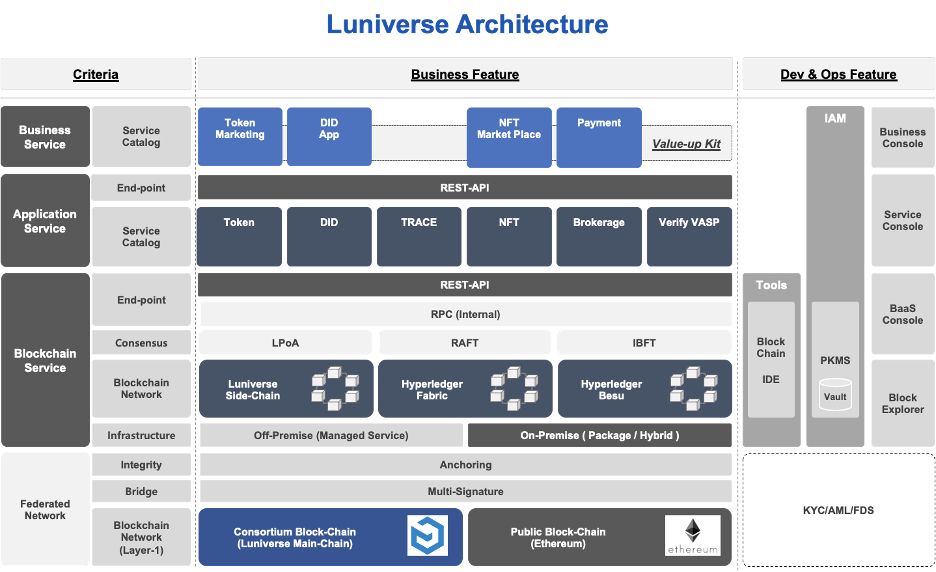 - 인프라 : 루니버스는 아마존(Amazon) AWS , NCP(Naver Cloud Platform) 등 멀티 클라우드 환경을 제공한다. 사용자는 AWS 나 NCP 등 원하는 클라우드나 자체 구축한 프라이빗 클라우드에 루니버스에서 제공하는 블록체인을 설치,운영할 수 있다.