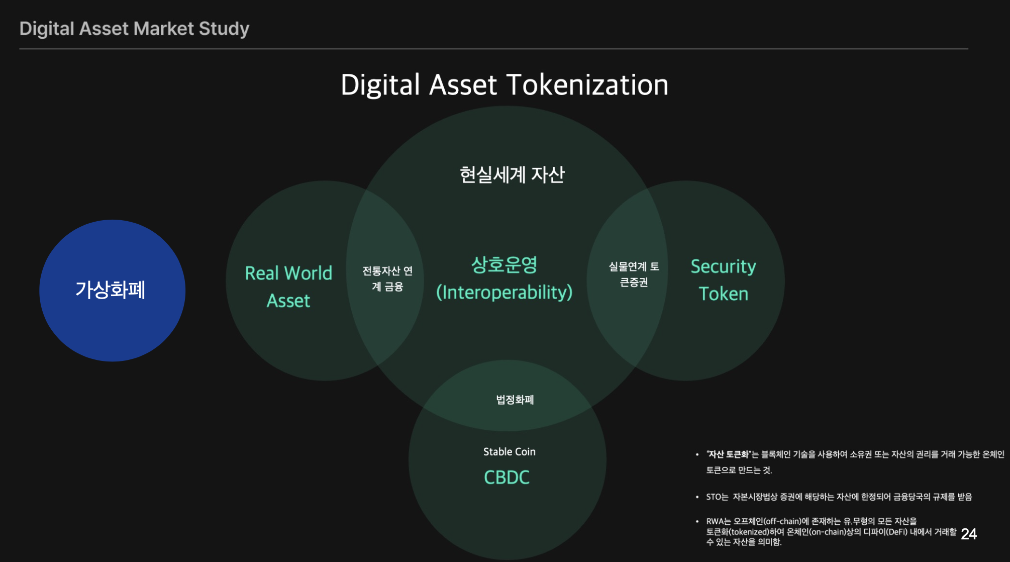 2024년 제가 가장 중요하게 보았던 디지탈 자산 분야는 Stable Coin , RWA 였습니다. 그리고 국내 여건상 STO와 CBDC는 증권사와 한국은행에서 적극적으로 추진하고 있으나 실제 글로벌 여건과 국내 정치상황을 볼때 쉽지 않고 다소 많은 시간이 걸릴 것으로 예상했습니다.