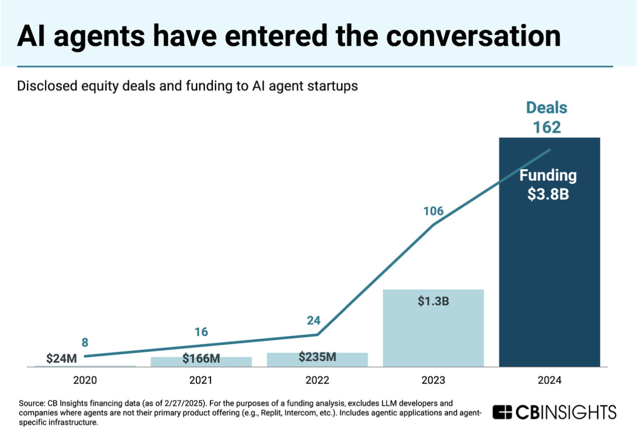 CB Insights "What’s next for AI agents?" 보고서에 따르면, AI 에이전트 시장이 빠르게 발전하고 있으며, 기업들의 관심과 투자가 폭발적으로 증가하고 있습니다. AI 에이전트는 단순한 보조 도구를 넘어, 최소한의 개입으로도 복잡한 작업을 수행하는 수준까지 발전하고 있습니다.