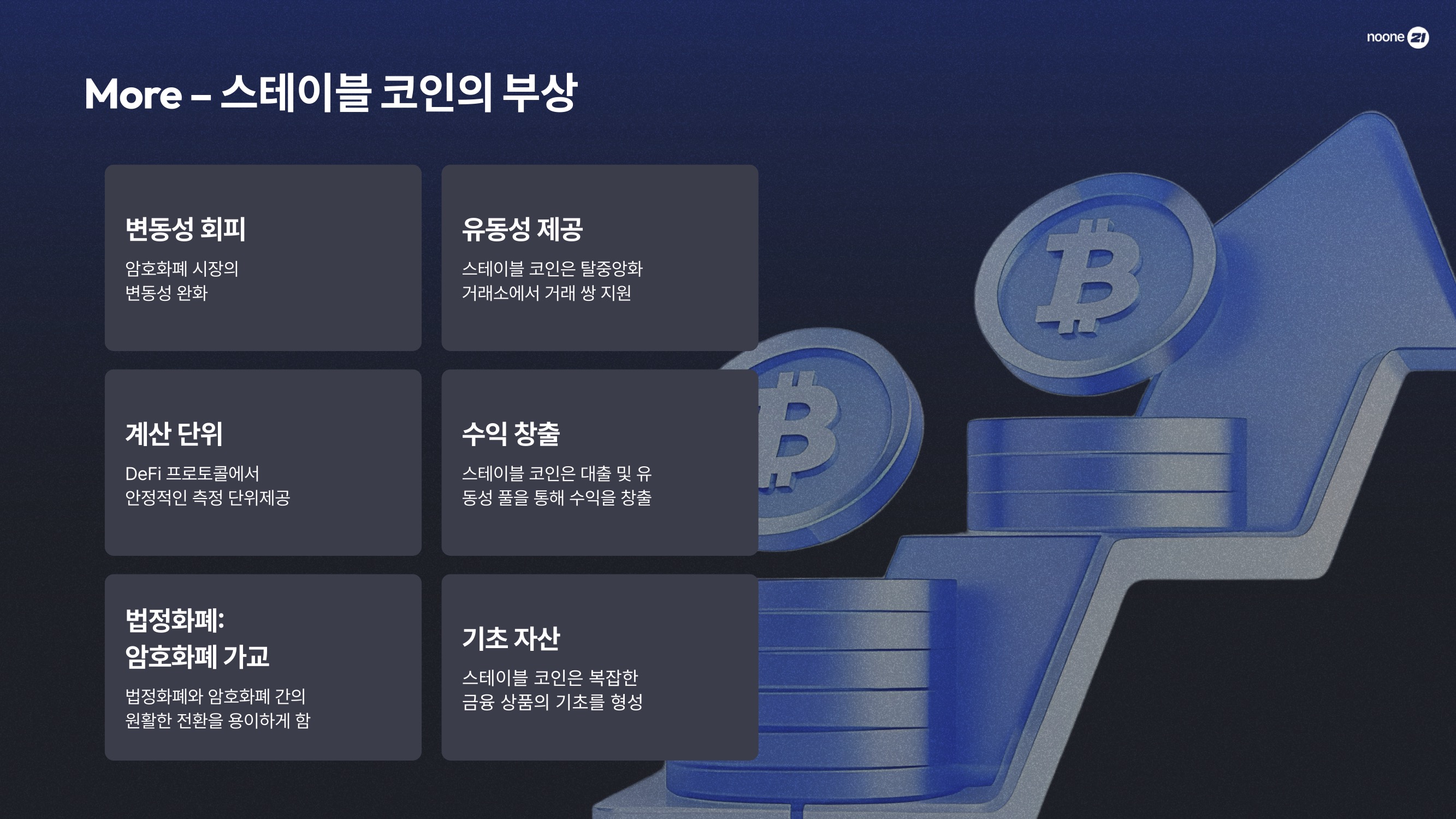 스테이블 코인은 변동성이 없어서 송금이나 결제 같은 실생활에 쓰기 좋고, 법정화폐와 암호화폐 시장을 연결해 주는 역할도 해요. DeFi 상품의 기초자산이기도 하고, 이자를 주는 등 사용자 입장에서는 꽤 유용하죠.