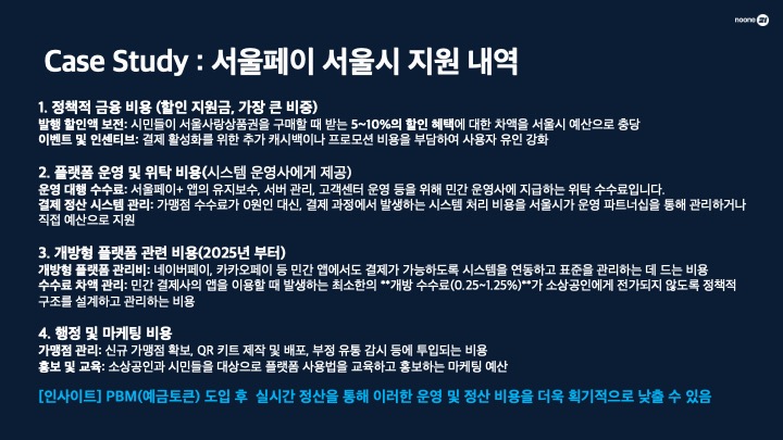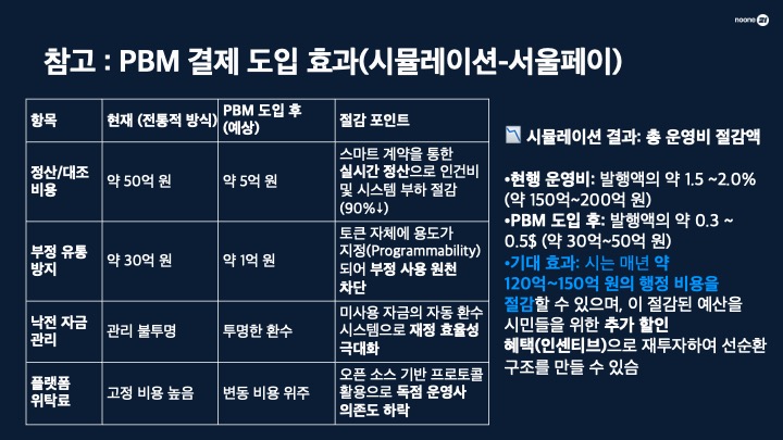 서울시 사례 시뮬레이션 결과, PBM 도입 시 정산 및 부정 유통 방지 비용 등이 대폭 줄어들어 매년 약 120억~150억 원의 행정 비용 절감이 기대됩니다. 이렇게 절감된 예산은 다시 시민을 위한 추가 할인 혜택으로 재투자되는 선순환 구조를 만들 수 있습니다.