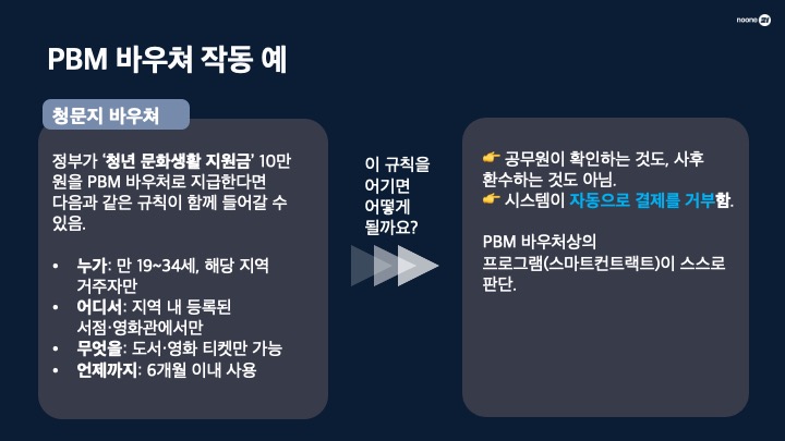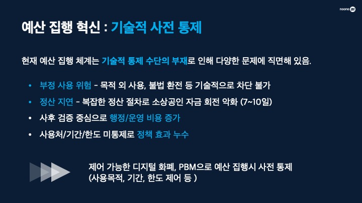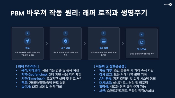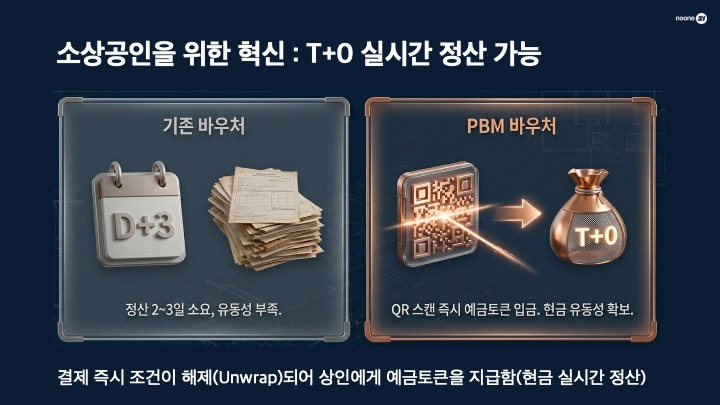 PBM 도입 효과: 결제 즉시 조건이 해제되어 상인에게 실시간 정산이 가능해집니다. 또한 사용 목적과 기간을 미리 제어하므로 세금 누수를 원천 차단하고 행정 비용을 획기적으로 낮춥니다.