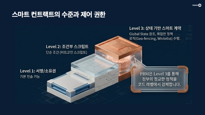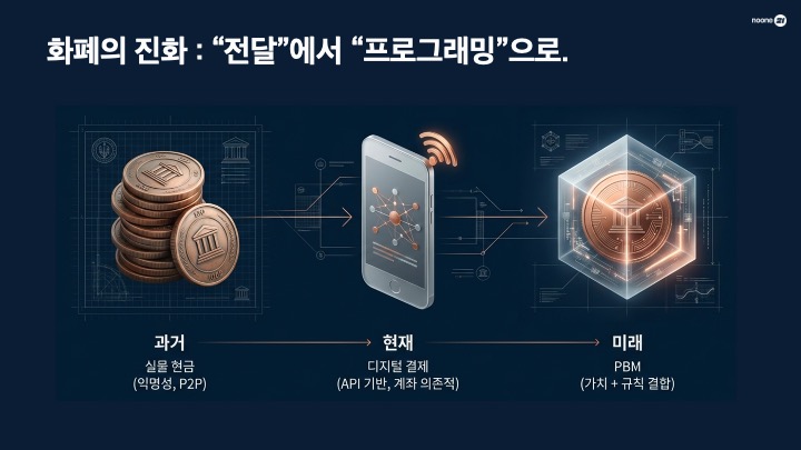미래 (PBM): 돈 자체에 '가치 + 규칙'이 결합된 형태입니다. 시스템이 돈을 옮기는 것이 아니라, 돈 스스로가 조건에 맞는지 판단하여 움직이는 '똑똑한 화폐'의 시대가 옵니다.