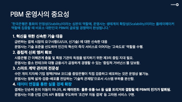 정부는 특정 앱이나 은행에 독점권을 주는 대신, 누구나 연결 가능한 '표준화된 PBM 프로토콜'이라는 고속도로를 닦아야 합니다.